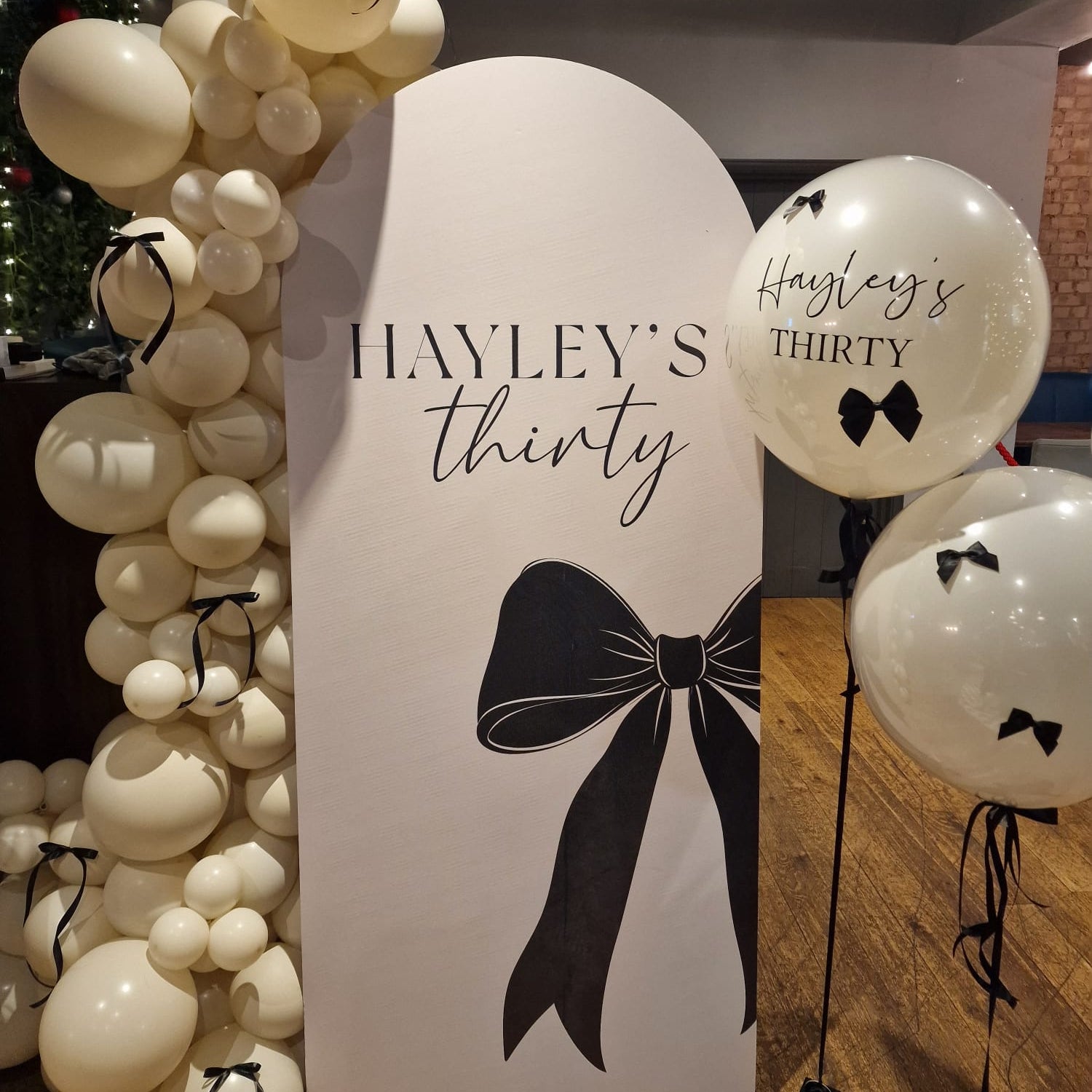 Elevate your celebration with this elegant cream cardboard backdrop, beautifully finished with a bold printed black bow. Designed to add a touch of chic sophistication, it’s the perfect photo-ready feature for parties, bridal showers, and hen parties.