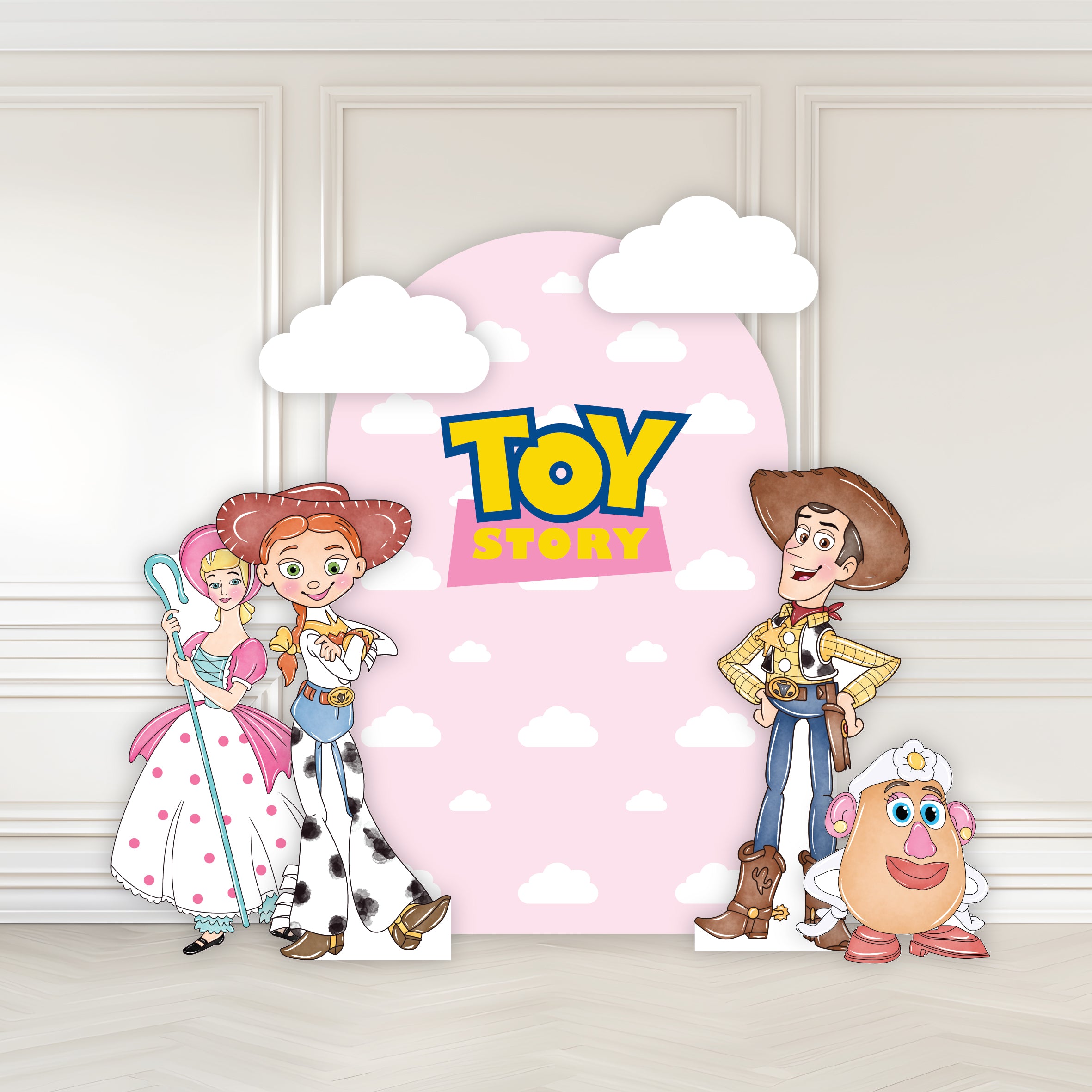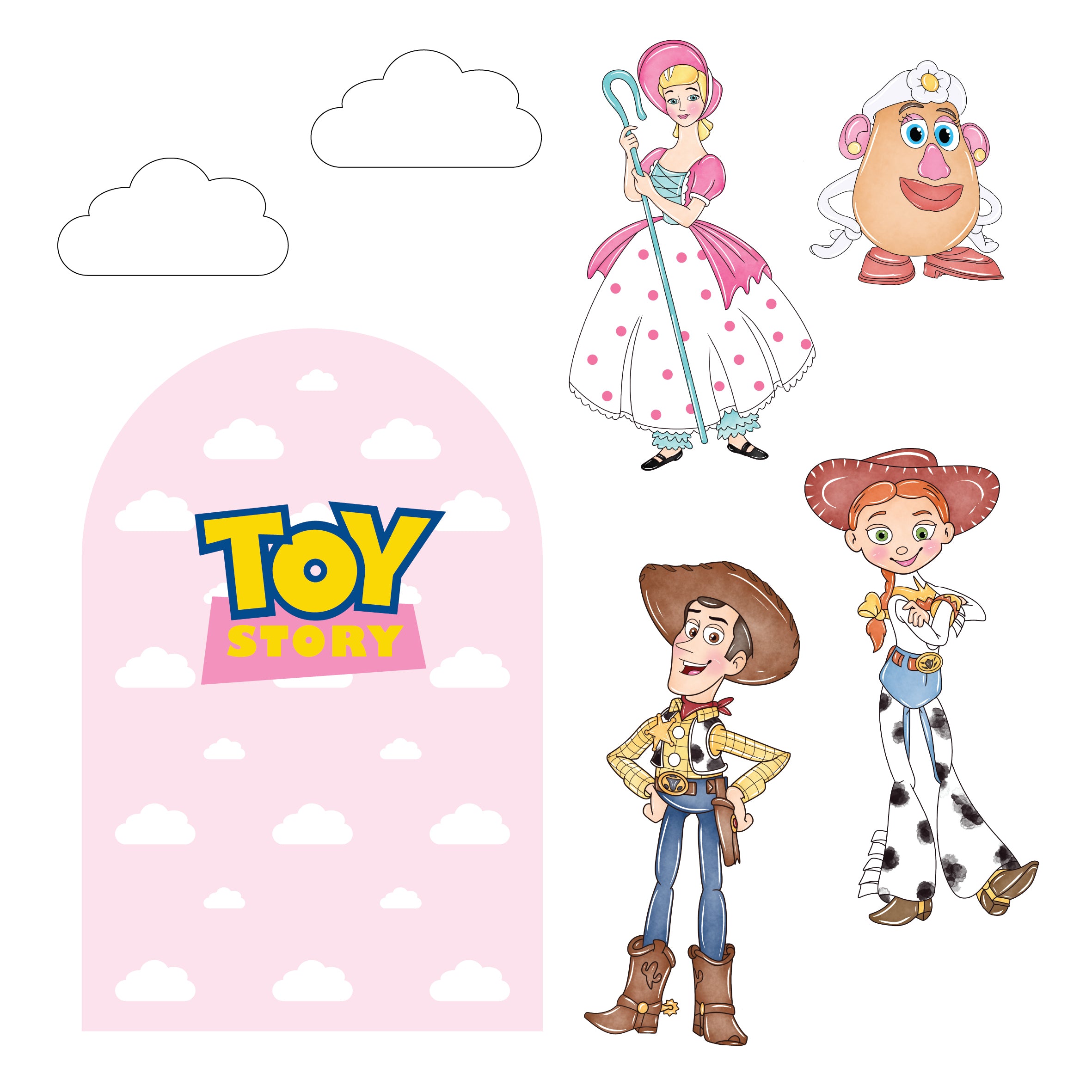 - 75cm Bo Peep, 39cm Mrs. Potato Head and x2 40cm white clouds all without stands.